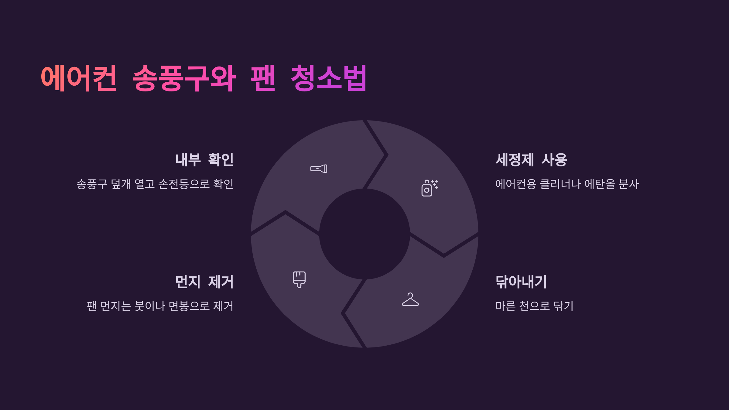 송풍구 안쪽과 팬 날개는 먼지가 제일 많은 곳이에요. 이 부분은 살짝 까다롭지만 이렇게 하면 쉬워요:
