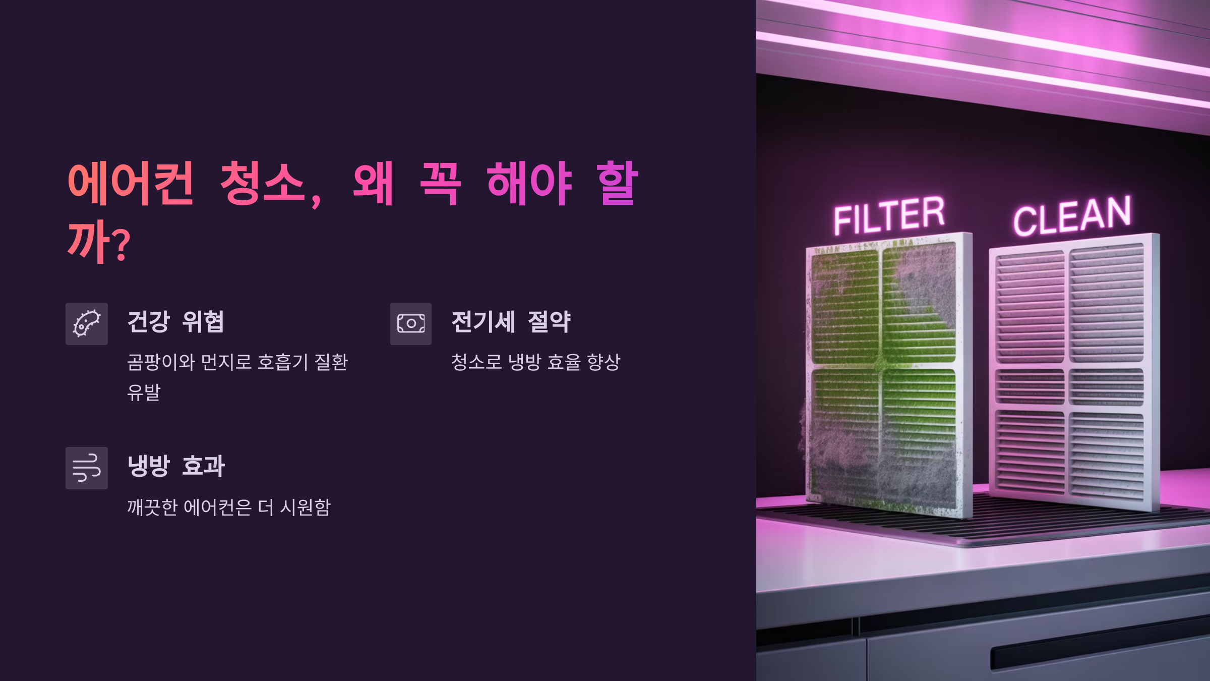 에어컨에서 쉰 냄새 나거나 틀자마자 재채기 나온 적 있으시죠? 그건 곰팡이나 먼지가 쌓여 있다는 신호예요. 청소하지 않으면 공기 중 오염물질이 그대로 실내에 퍼져 호흡기 건강에도 안 좋아요. 게다가 내부가 더러우면 냉방 효율도 떨어지고, 전기세는 쑥쑥 올라간다는 거! 그래서 정기적인 청소는 선택이 아닌 필수랍니다.