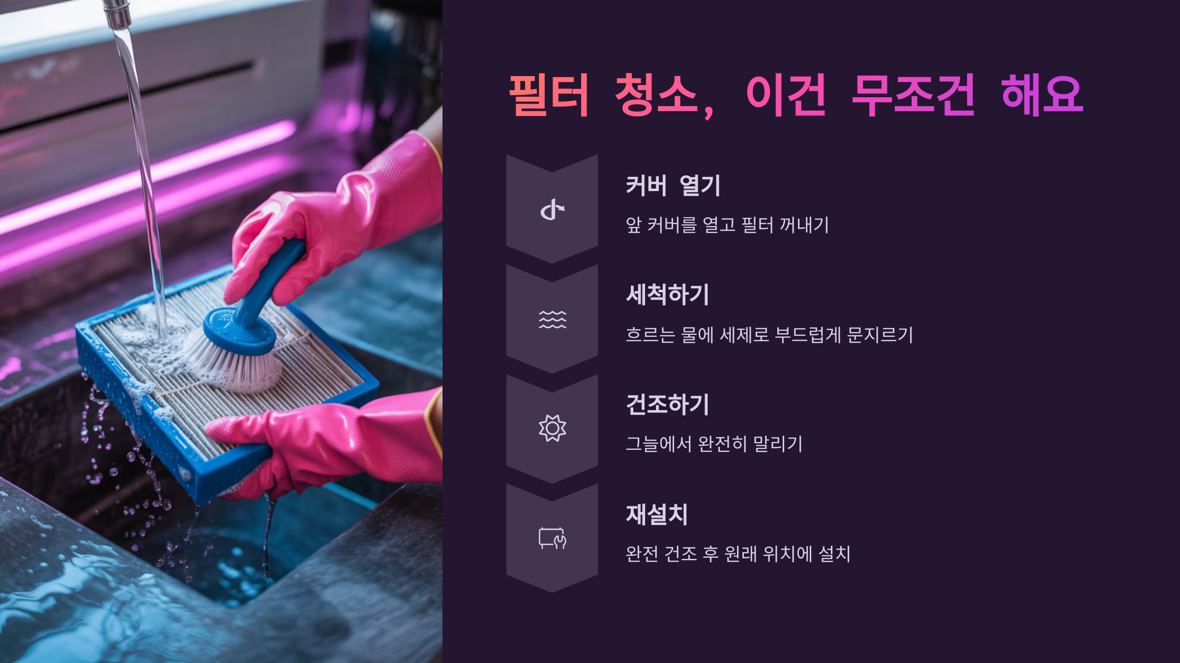 에어컨 청소의 핵심 중 핵심은 바로 필터! 필터가 더러우면 아무리 세게 틀어도 냄새만 나고 시원하지 않아요. 방법은 간단해요. 앞 커버를 열고 필터를 꺼낸 후, 흐르는 물에 세제를 풀어 솔이나 칫솔로 부드럽게 문질러줍니다. 그 후 그늘에서 완전히 말리는 것이 중요해요. 젖은 채로 다시 끼우면 곰팡이 생기거든요!