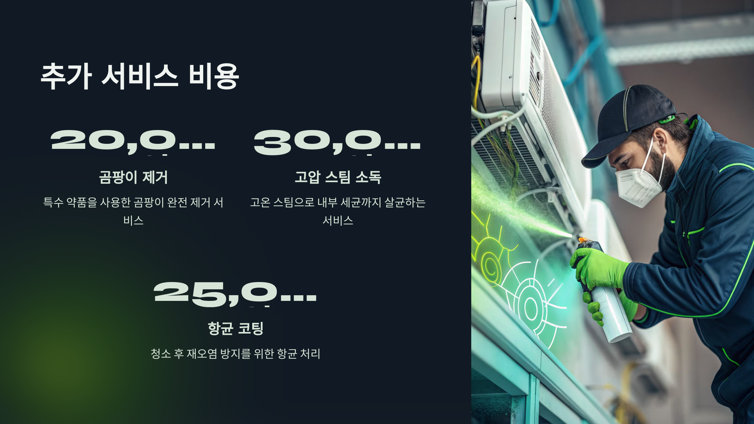 특수한 곰팡이 제거, 고압 스팀 소독, 항균 코팅 등의 옵션에 따라 비용이 추가될 수 있습니다.