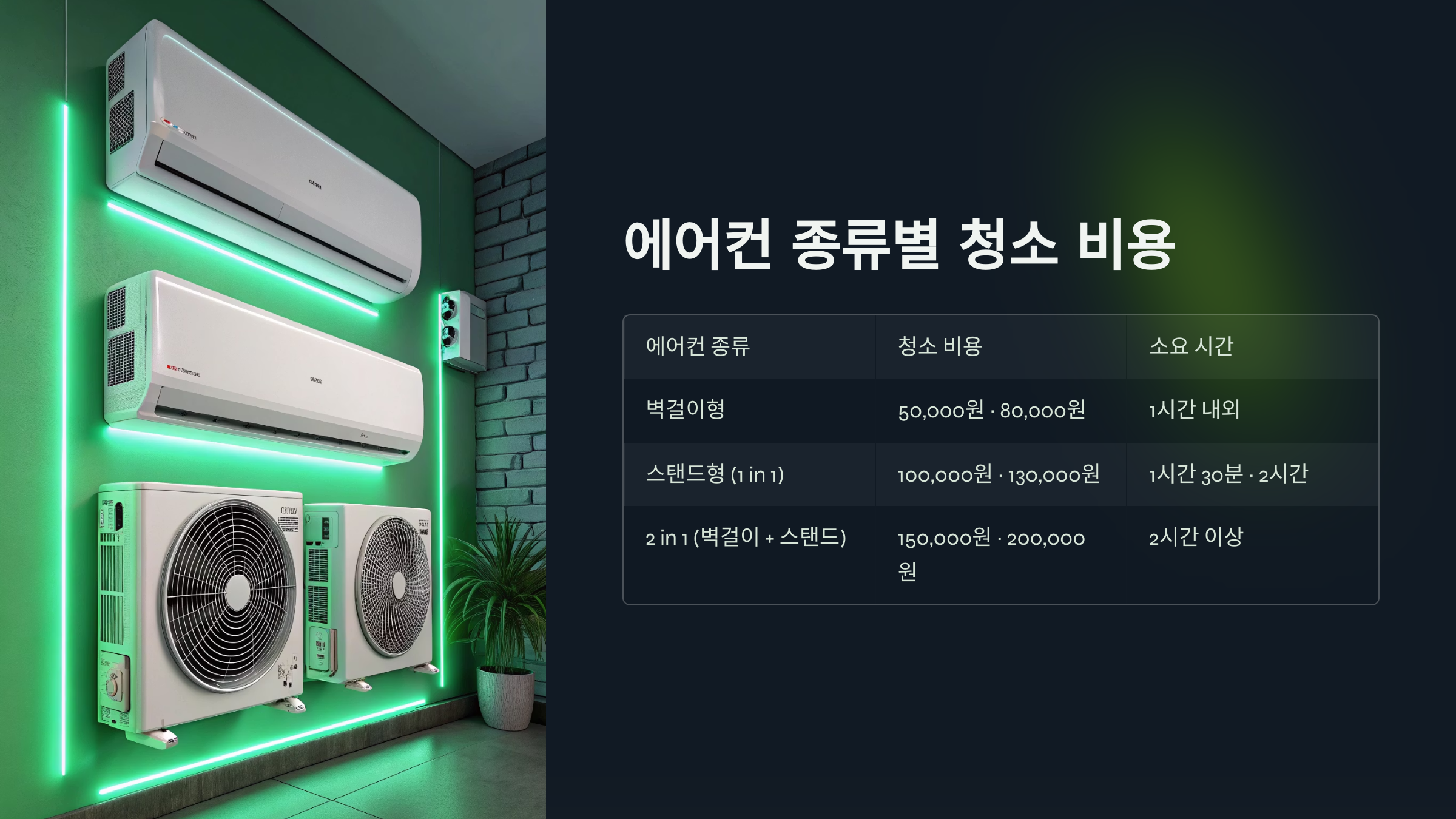 | 에어컨 종류 | 청소 비용 | 소요 시간 |