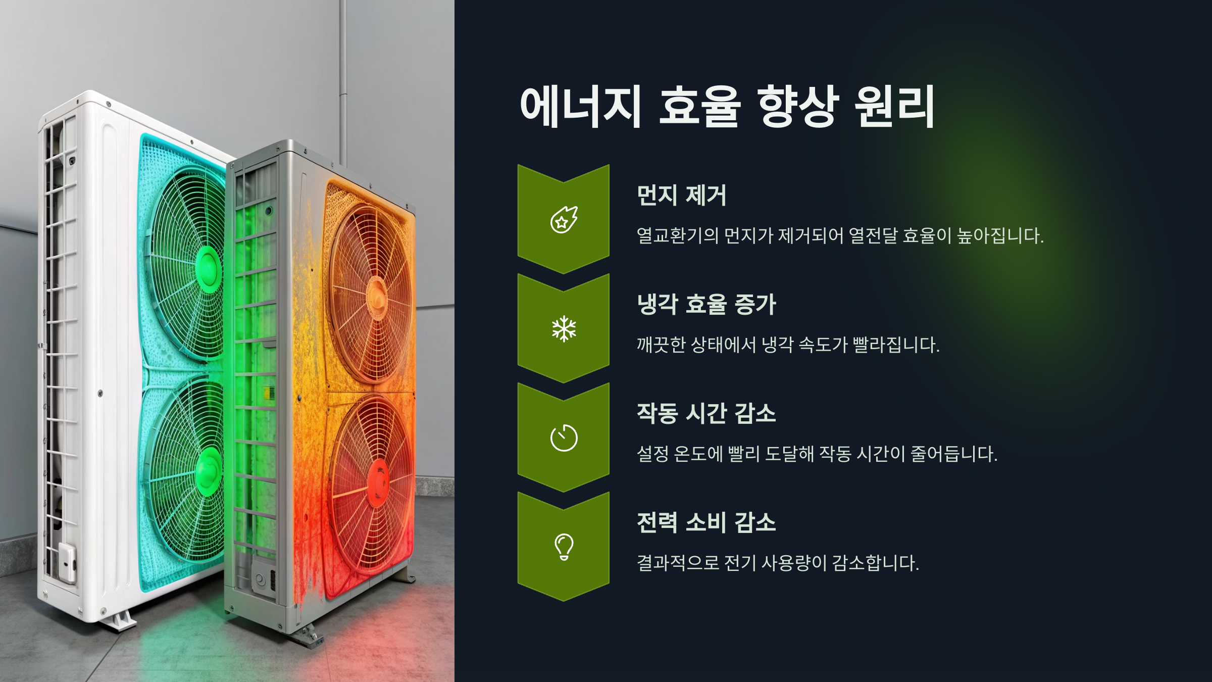 A. 네. 먼지와 이물질이 제거되면 냉방 효율이 올라가고 에너지 낭비가 줄어들어 전기세도 줄어듭니다.
