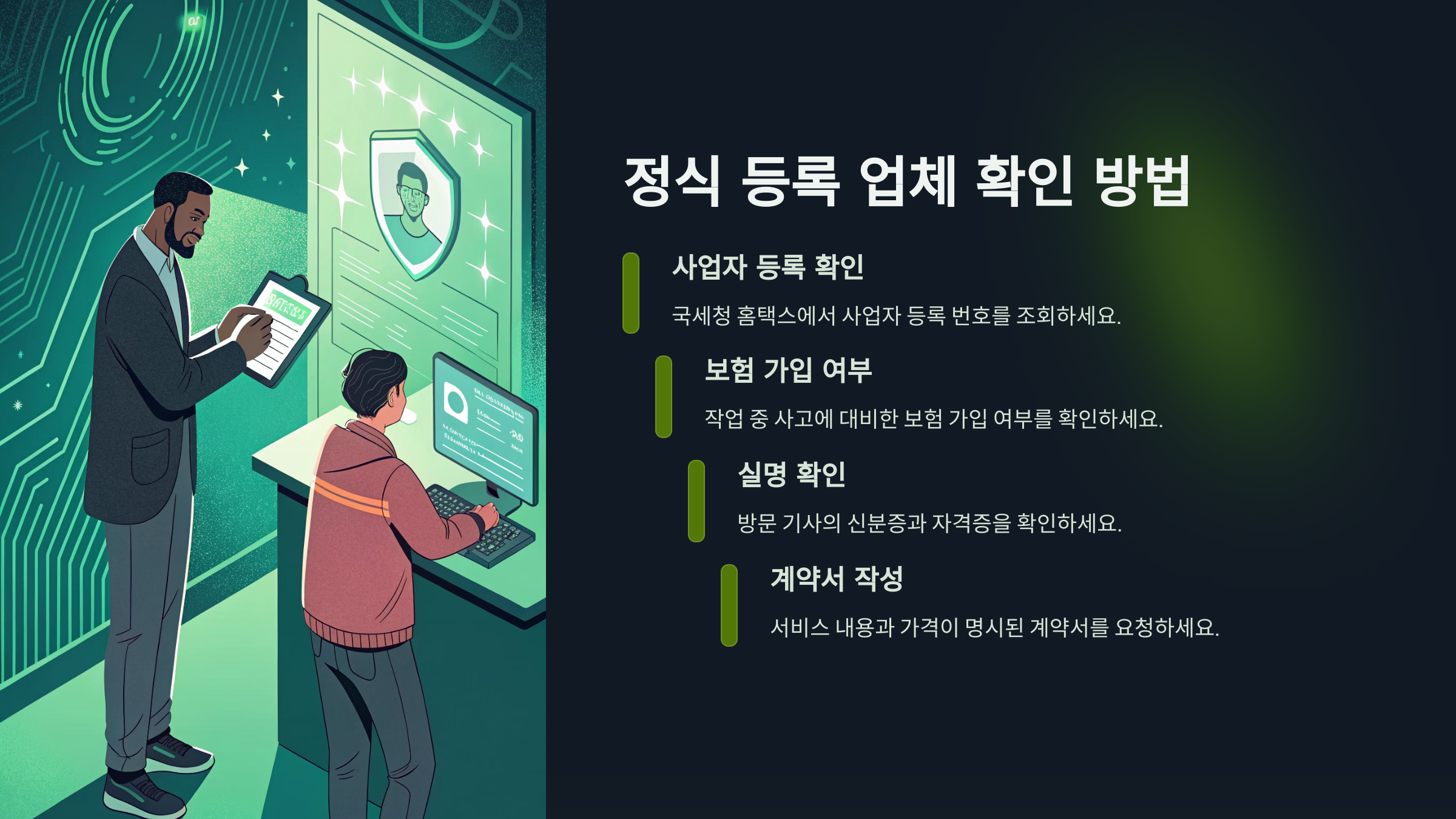 A. 가격만 보지 말고 후기, 자격증 보유 여부, AS 정책 등을 확인하세요. 정식 등록 업체인지 확인하는 것도 중요합니다.