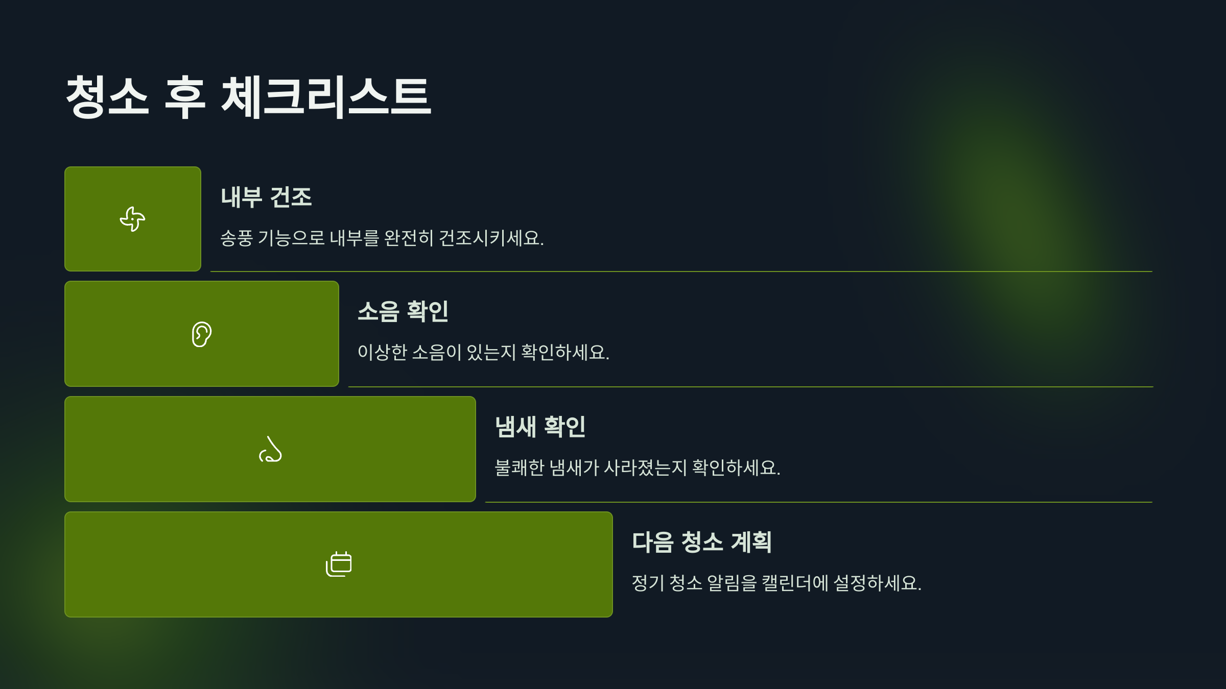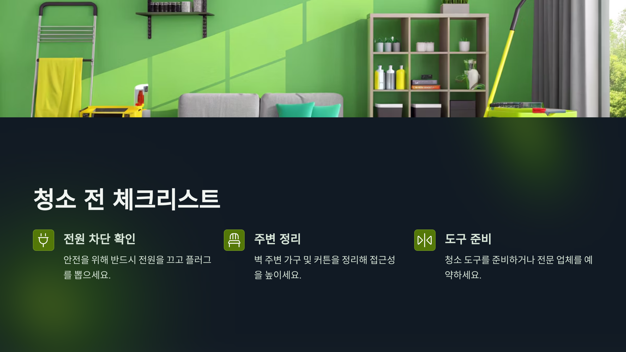 - 청소 도구 준비 또는 업체 예약