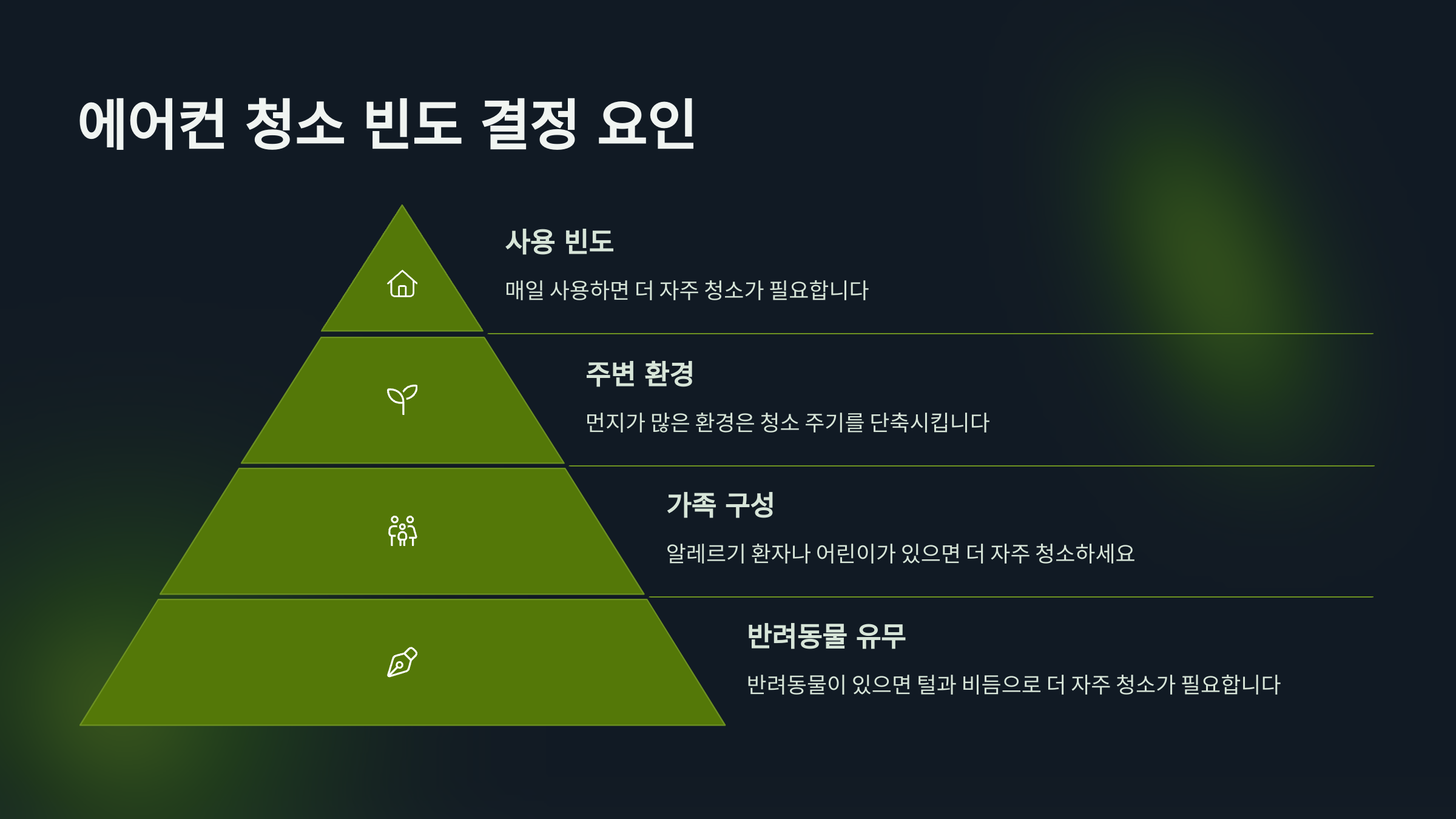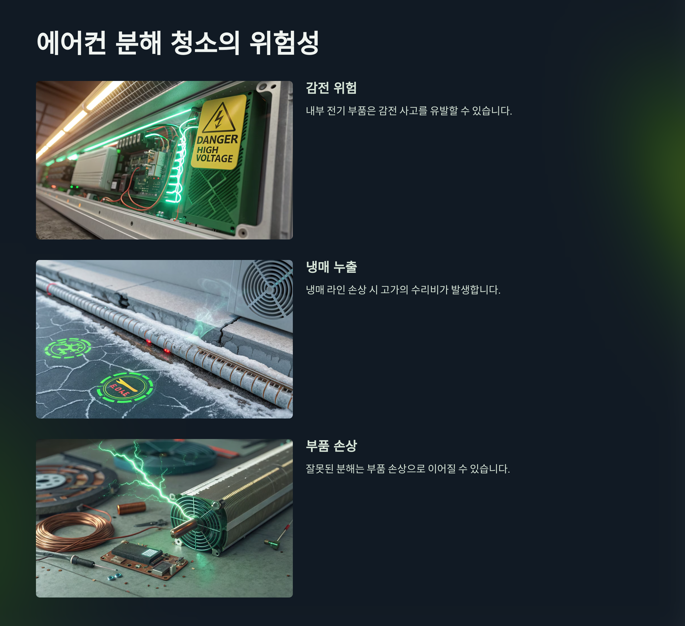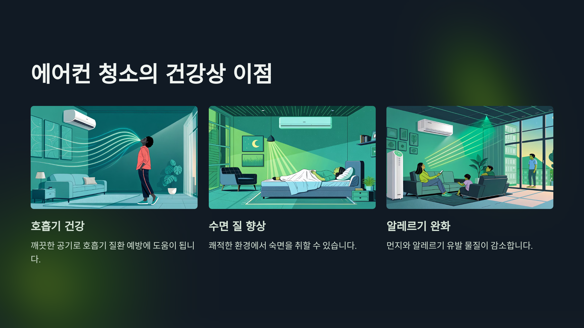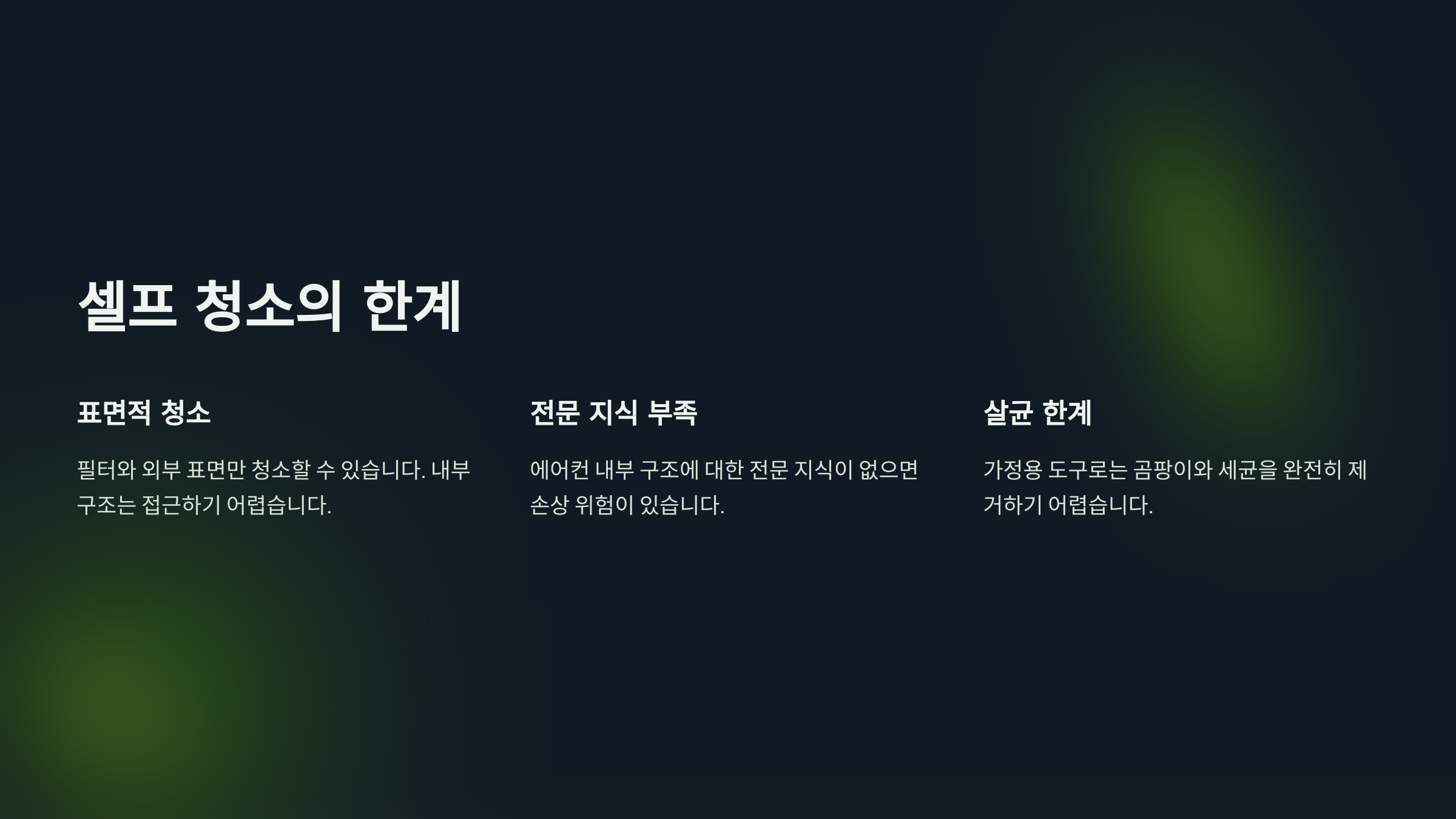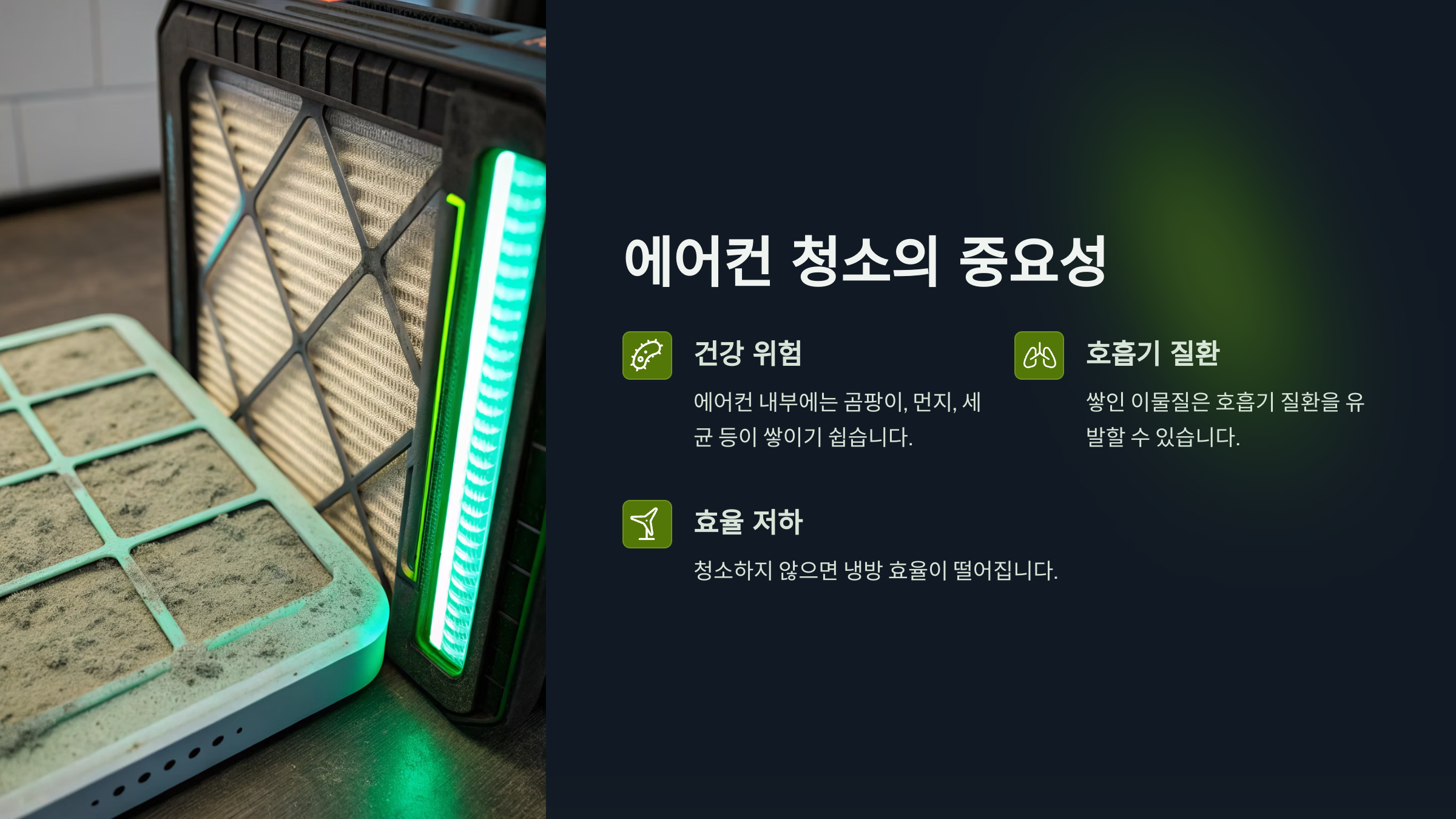 에어컨 내부에는 곰팡이, 먼지, 세균 등이 쌓이기 쉽습니다. 이물질은 냉방 효율을 떨어뜨릴 뿐 아니라 호흡기 질환을 유발할 수 있습니다. 특히 어린이, 노약자, 반려동물이 있는 가정에서는 더욱 주의가 필요하죠.