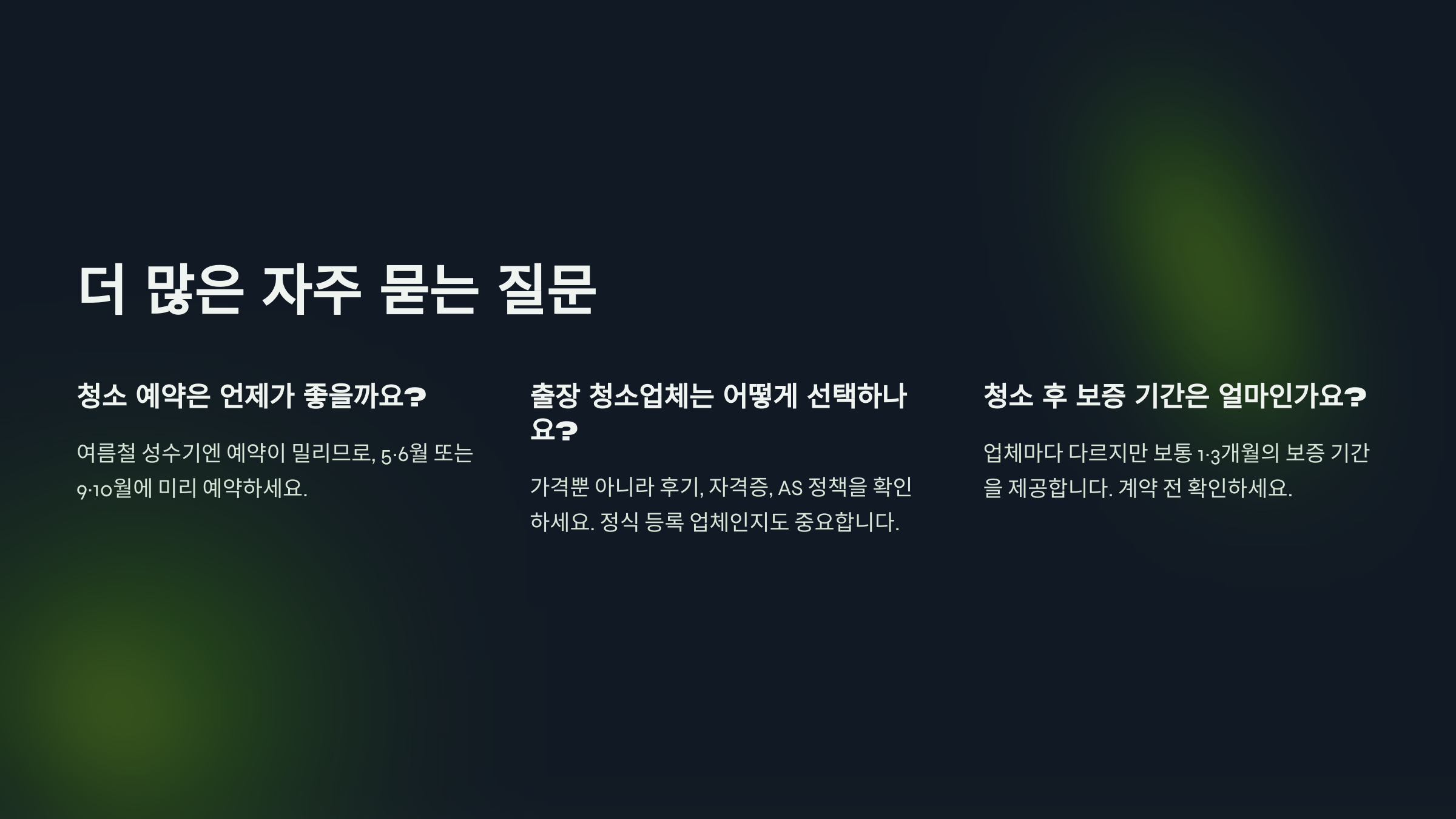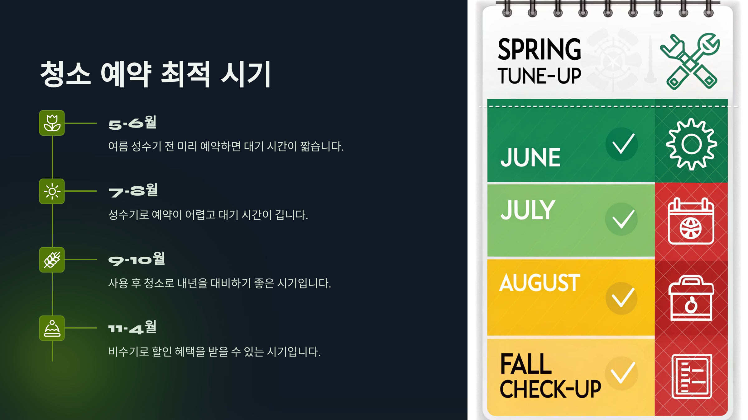 A. 여름철 성수기엔 예약이 밀리기 쉬우므로, 5~6월 또는 여름이 끝난 후인 9~10월에 미리 청소를 예약하는 것이 좋습니다.