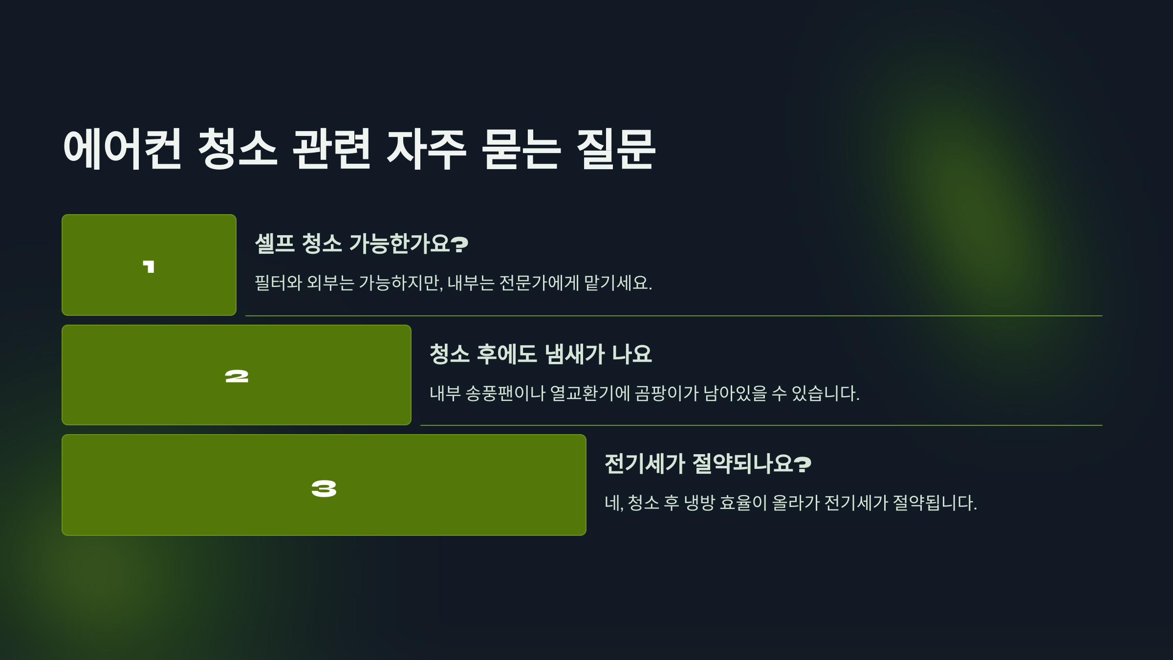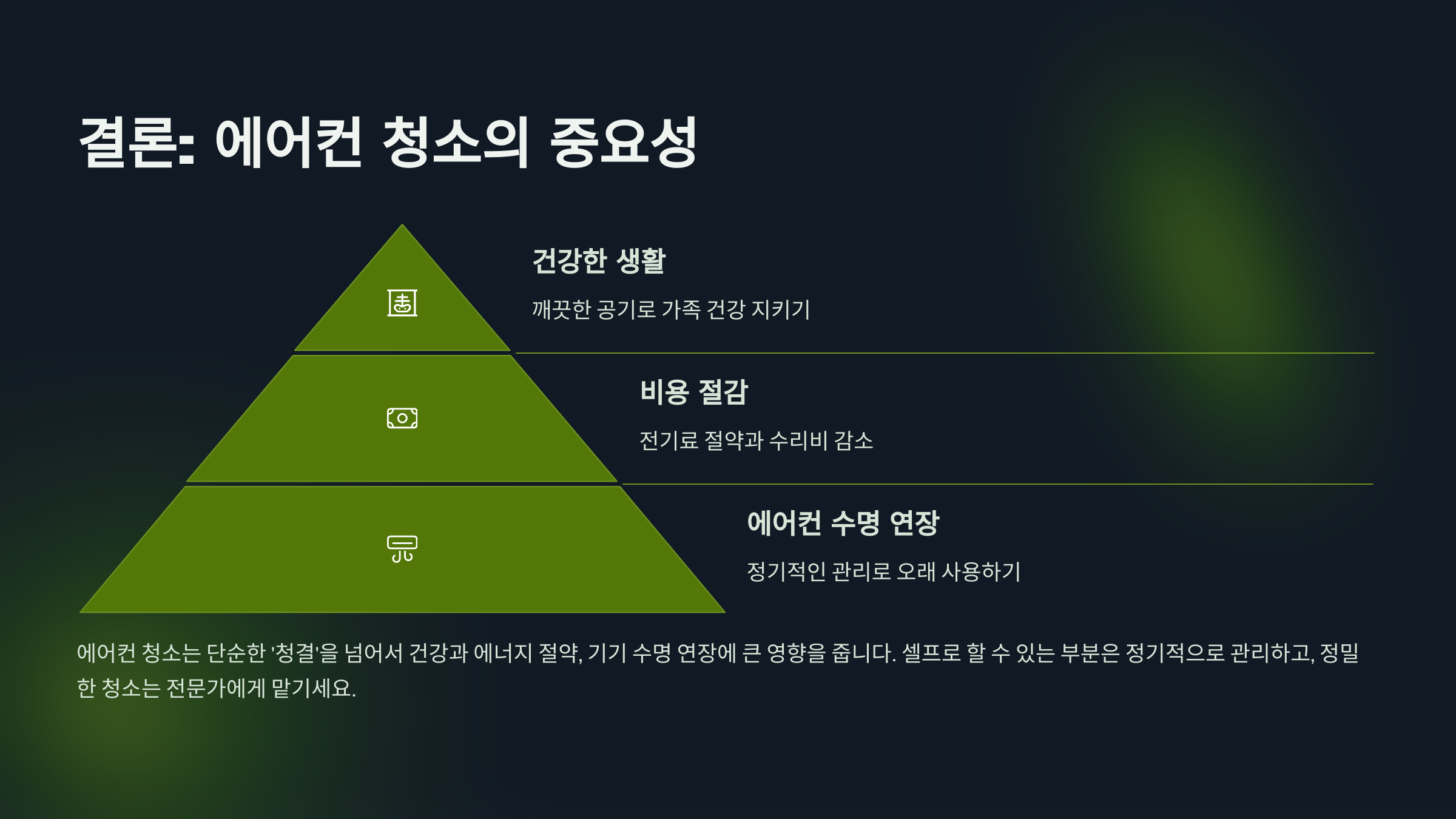 에어컨 청소는 단순한 '청결'을 넘어서 건강과 에너지 절약, 기기 수명 연장에 큰 영향을 줍니다. 셀프로 할 수 있는 부분은 정기적으로 관리하고, 정밀한 청소는 전문가에게 맡기세요. 깨끗한 에어컨은 여름철 쾌적한 실내 환경의 기본입니다. 아직 청소 안 하셨다면, 지금이 적기입니다!