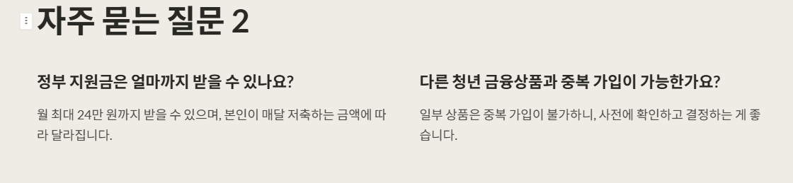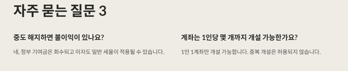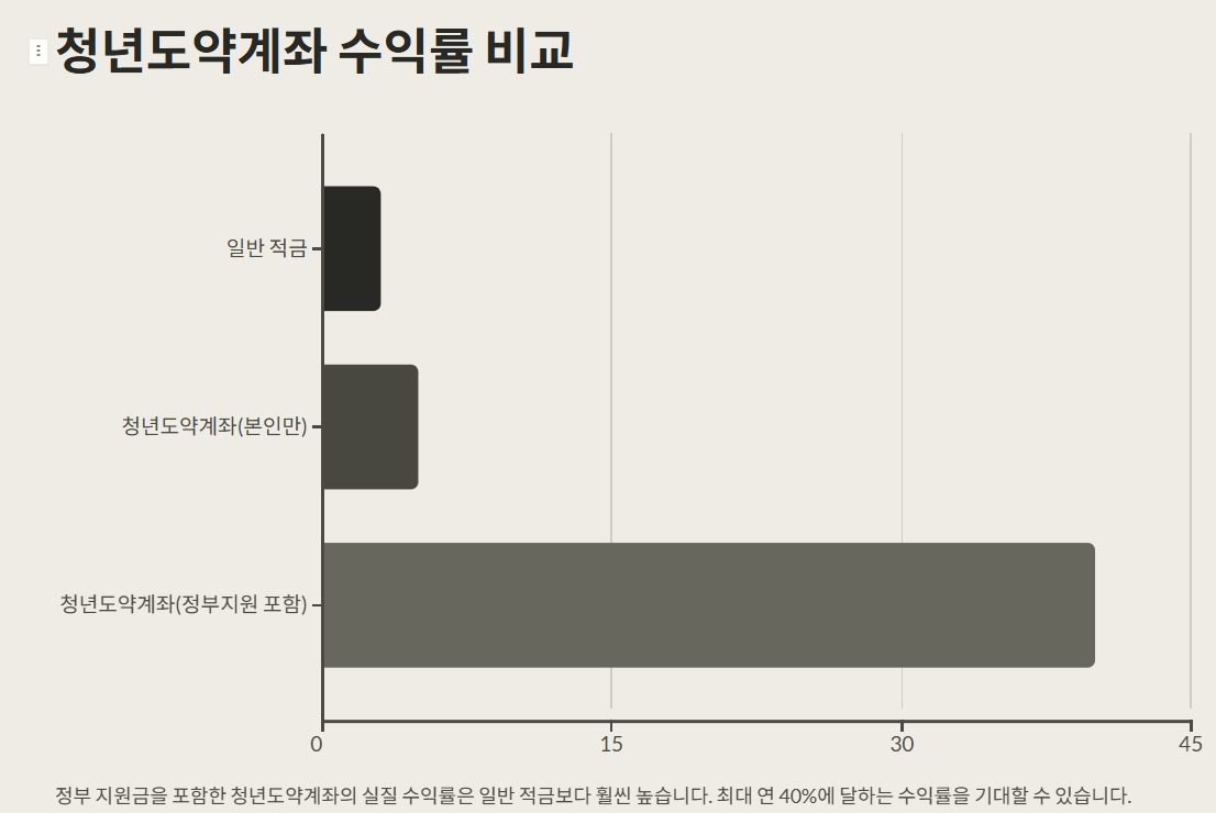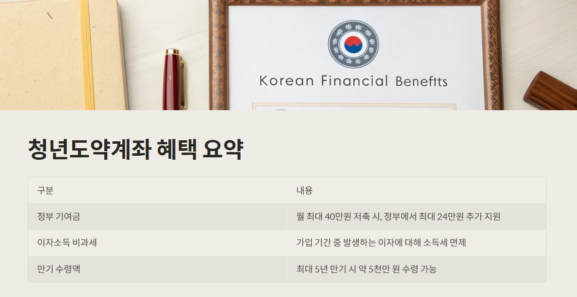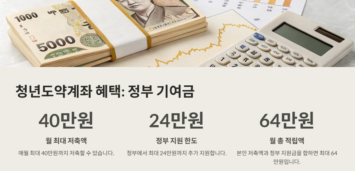 | 정부 기여금 | 월 최대 40만원 저축 시, 정부에서 최대 24만원 추가 지원 |