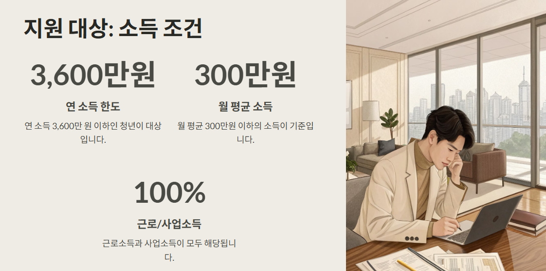 - 연 소득 3,600만 원 이하 (근로/사업자 기준)