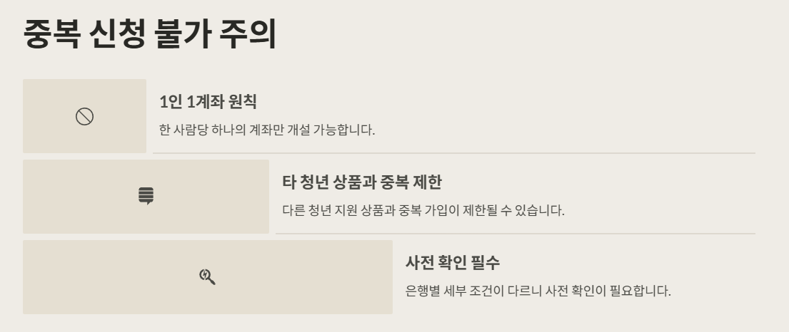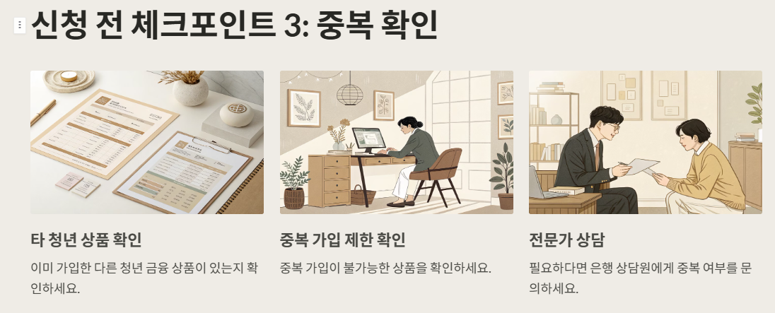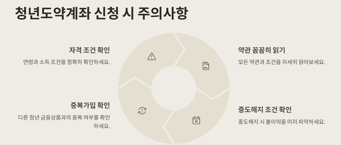 또한, 중복 신청이 불가능하다는 점! 이미 다른 청년 지원 상품에 가입돼 있다면 청년도약계좌 신청이 제한될 수 있어요. 은행별로도 세부 조건이 다르니, 사전 확인은 필수랍니다.