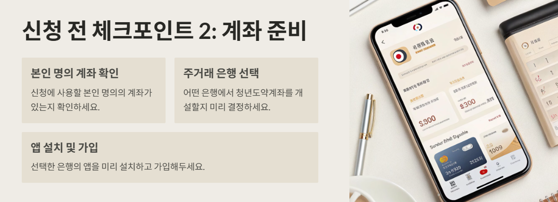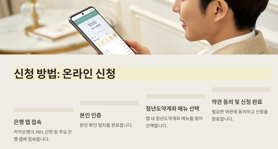 | 은행 앱(카카오뱅크, NH, 신한 등) | 본인 인증 → 청년도약계좌 메뉴 선택 → 약관 동의 → 신청 완료 | 신분증, 소득증빙자료(필요 시) |