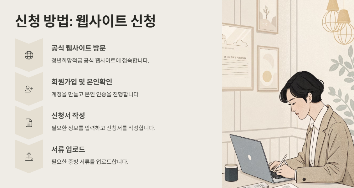 | 청년희망적금 공식 웹사이트 | 회원가입 → 본인확인 → 신청서 작성 → 서류 업로드 | 주민등록등본, 재직증명서 등 |