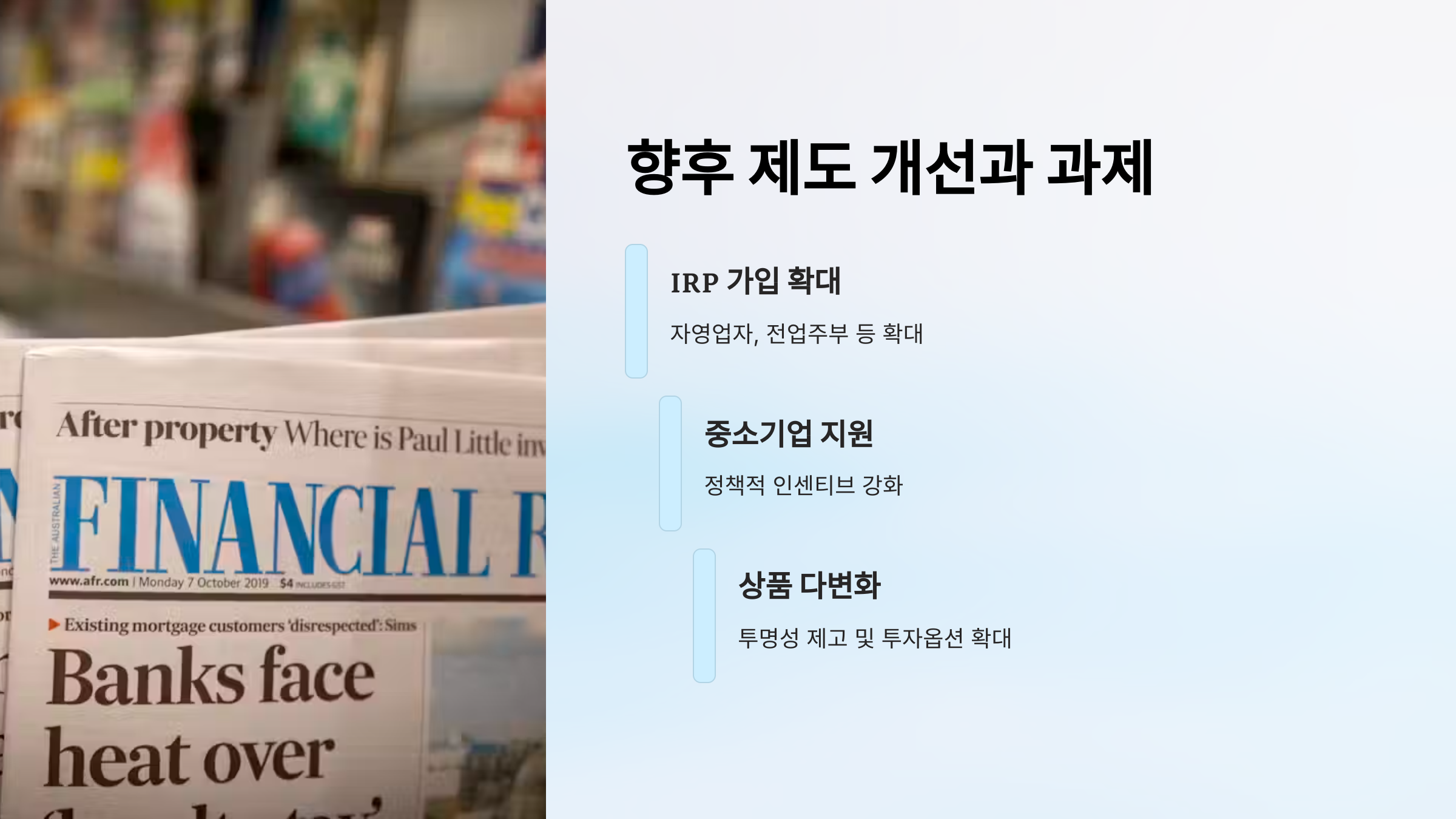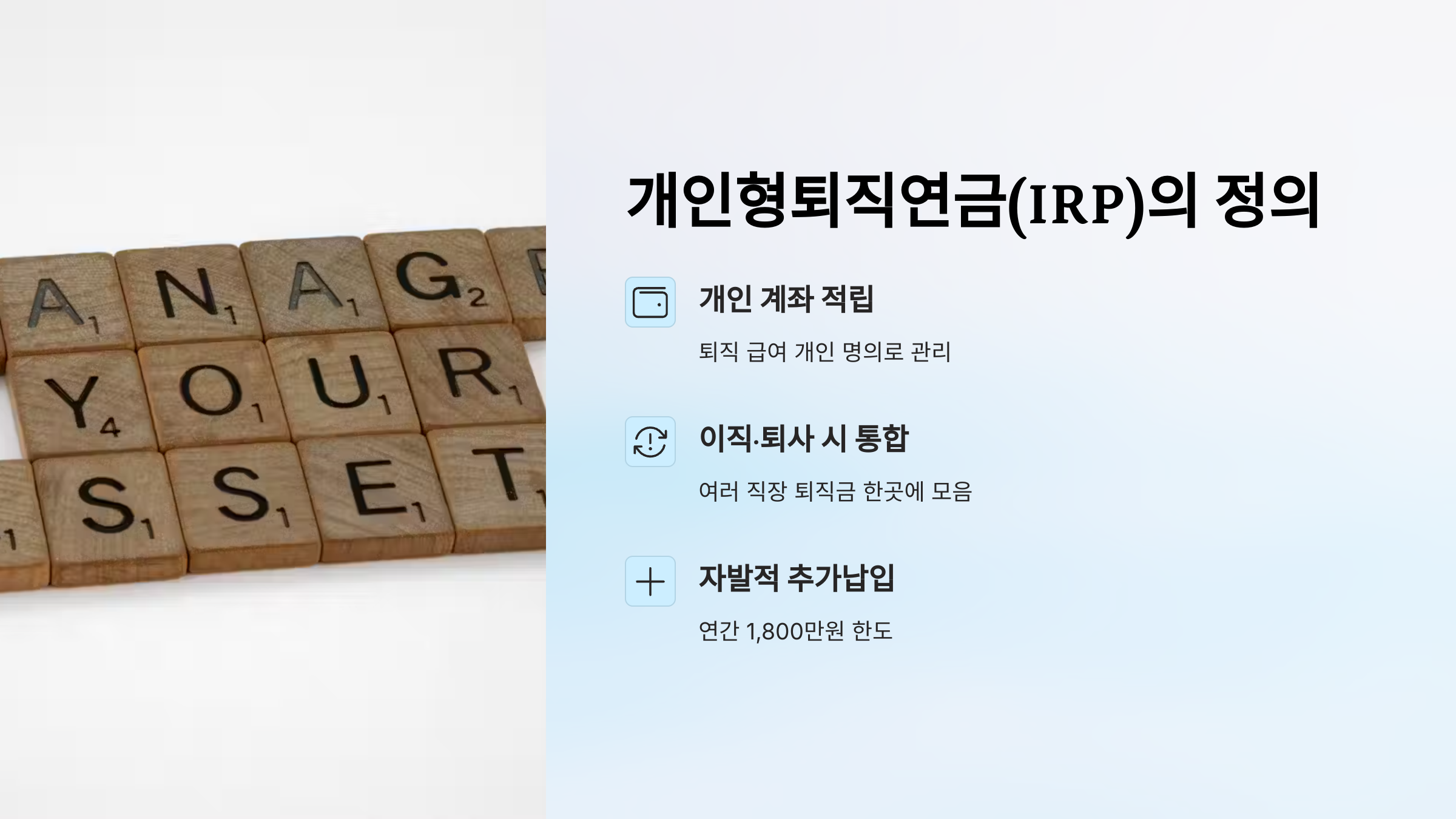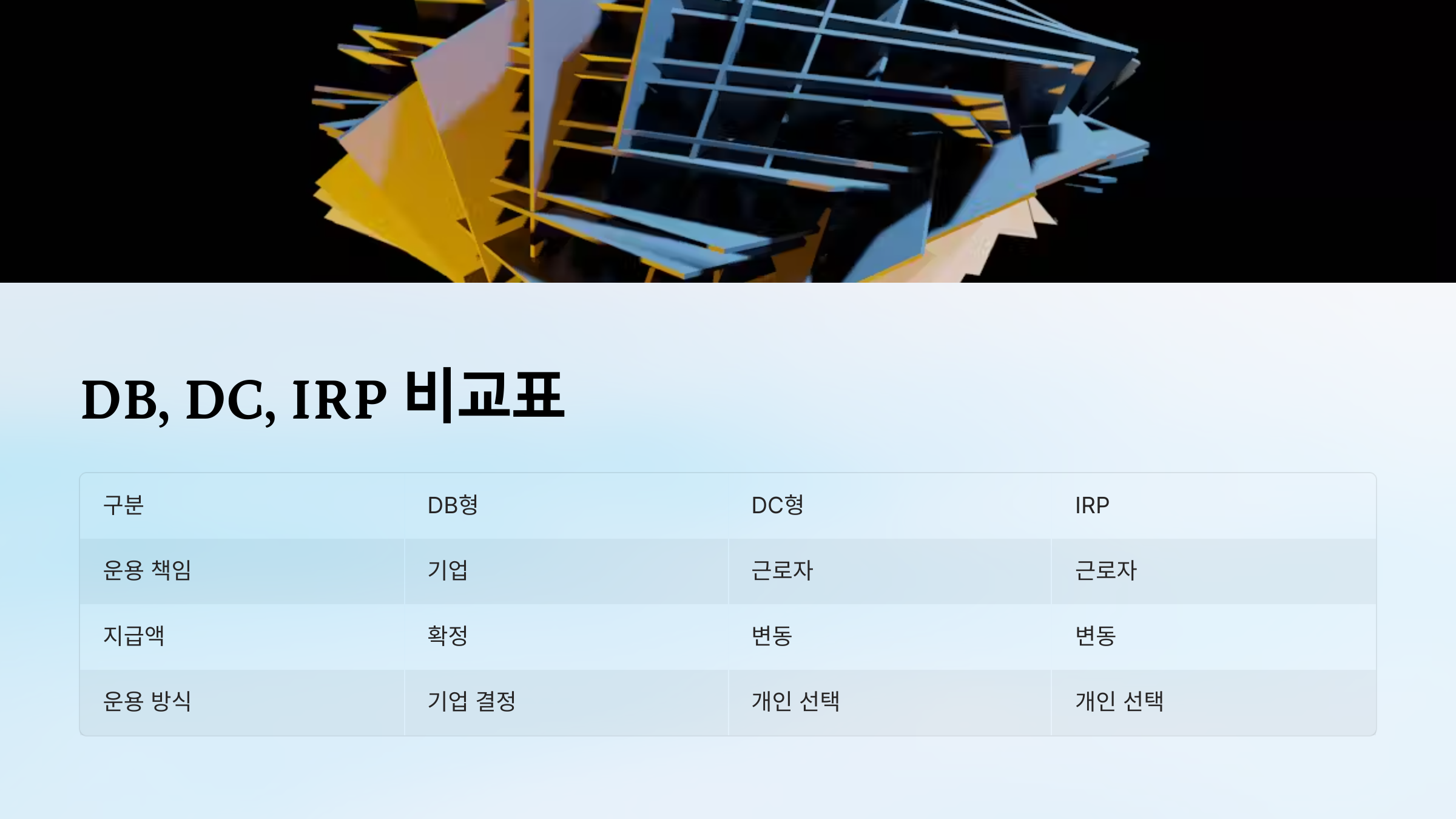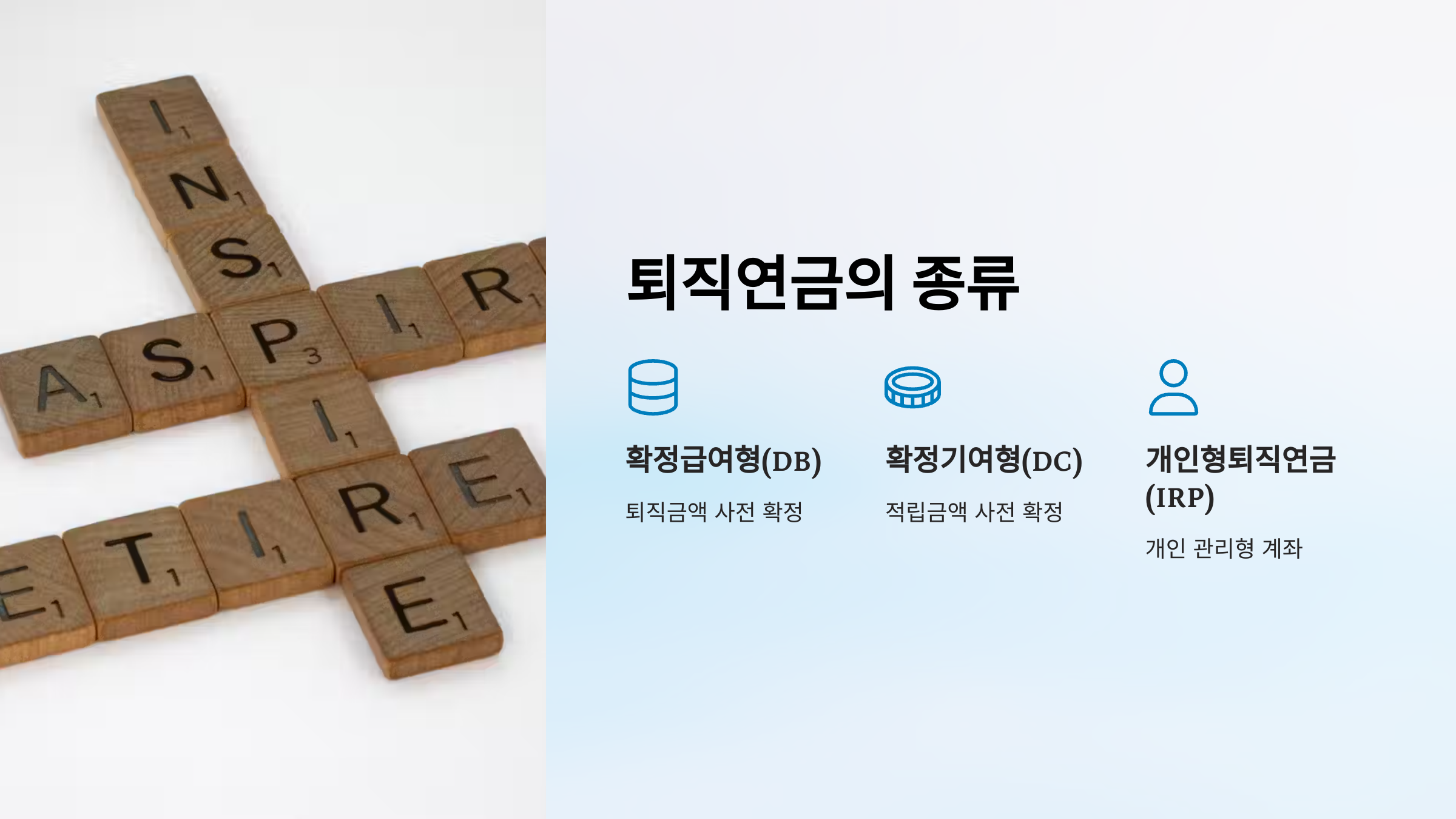 퇴직연금은 크게 세 가지 종류로 나눌 수 있어요. DB형(확정급여형), DC형(확정기여형), IRP(개인형퇴직연금)이 그것입니다. DB형은 퇴직 시 받을 금액이 사전에 정해져 있고, 회사가 책임지는 구조예요. 반대로 DC형은 회사가 매년 일정 금액을 내주면, 근로자가 운용을 직접 해서 나중에 금액이 달라질 수 있는 구조죠. IRP는 퇴직금이 들어오는 개인 계좌로, 개인이 추가로 돈을 넣을 수도 있는 유연한 제도랍니다.
