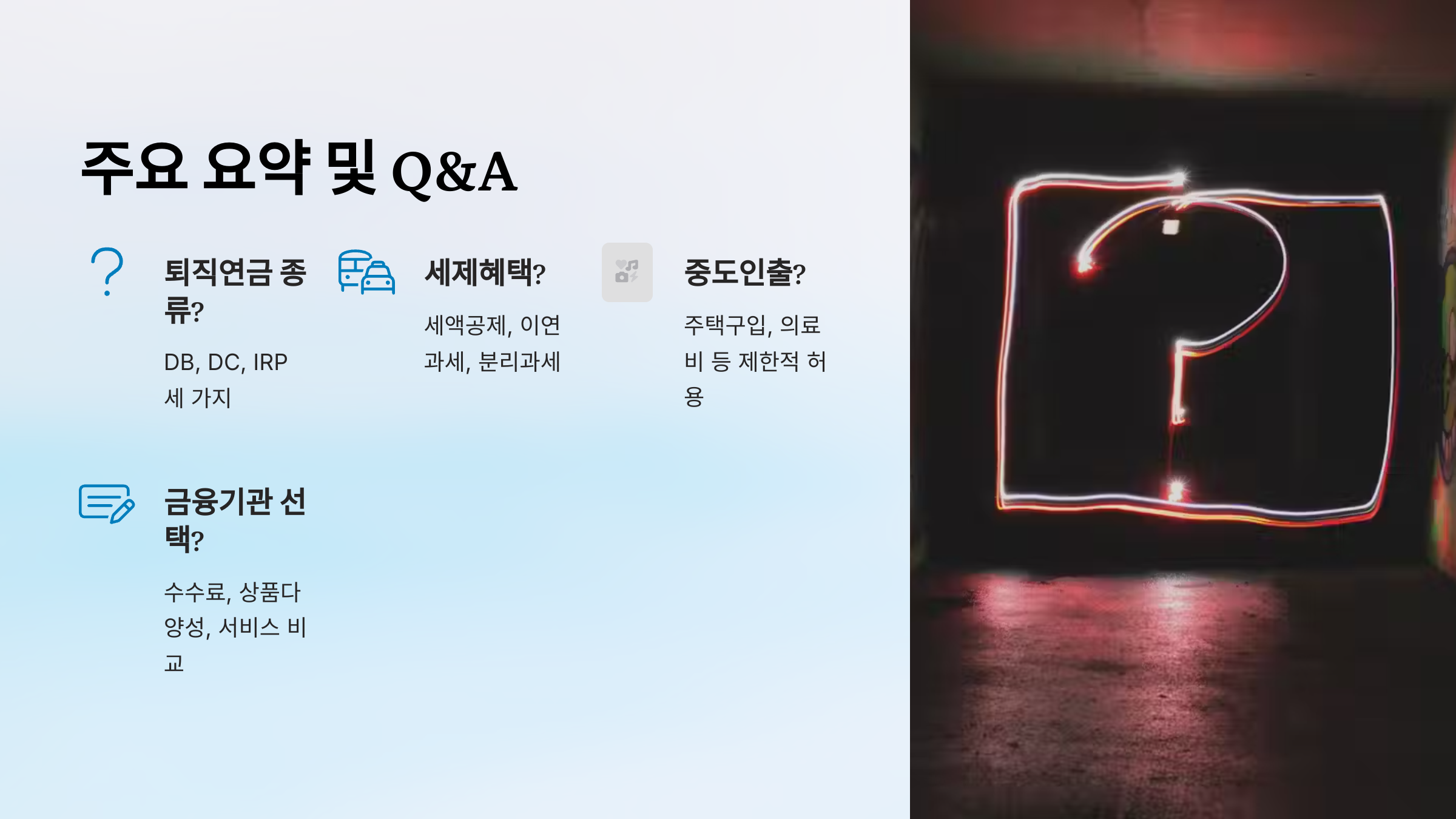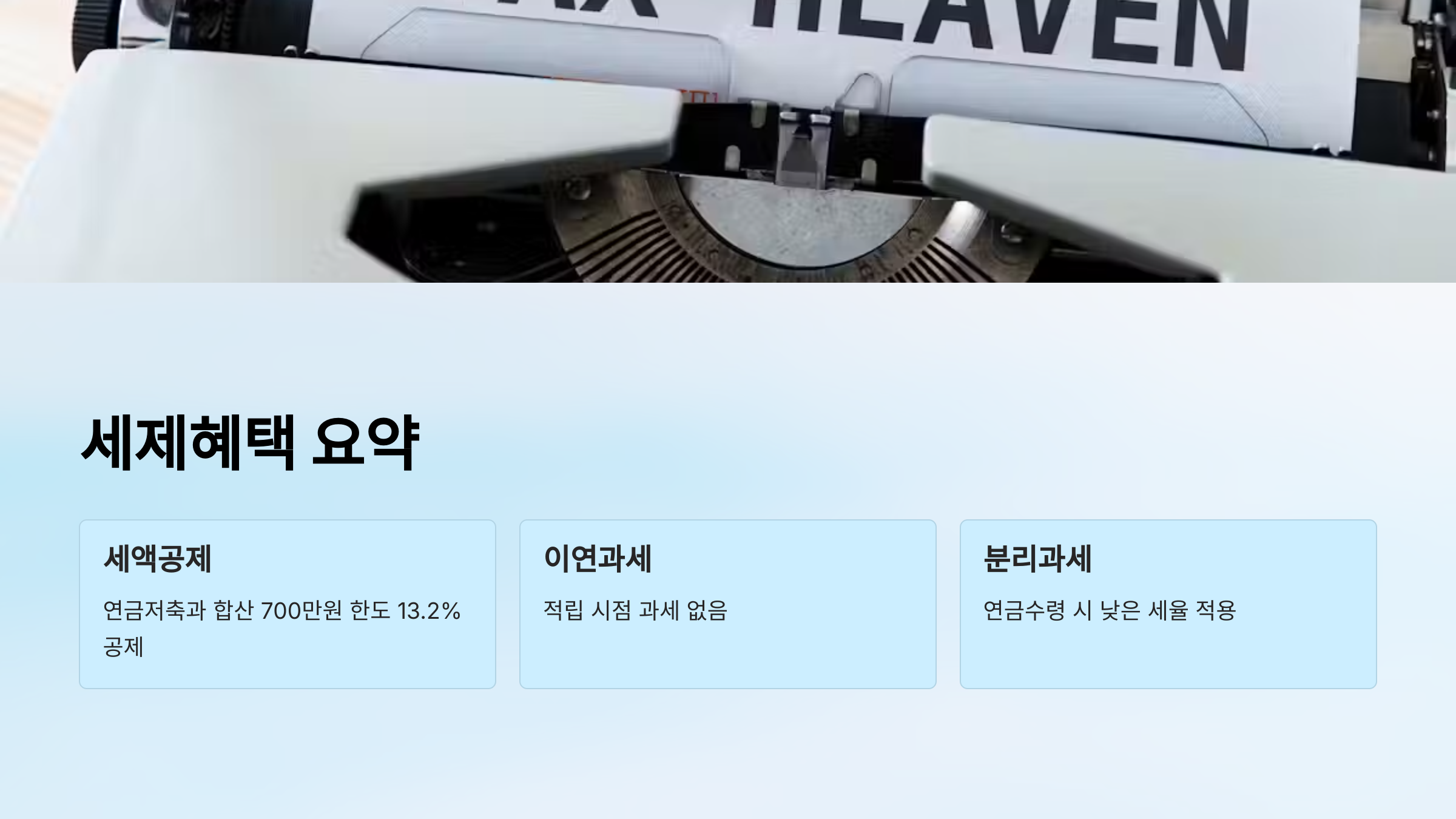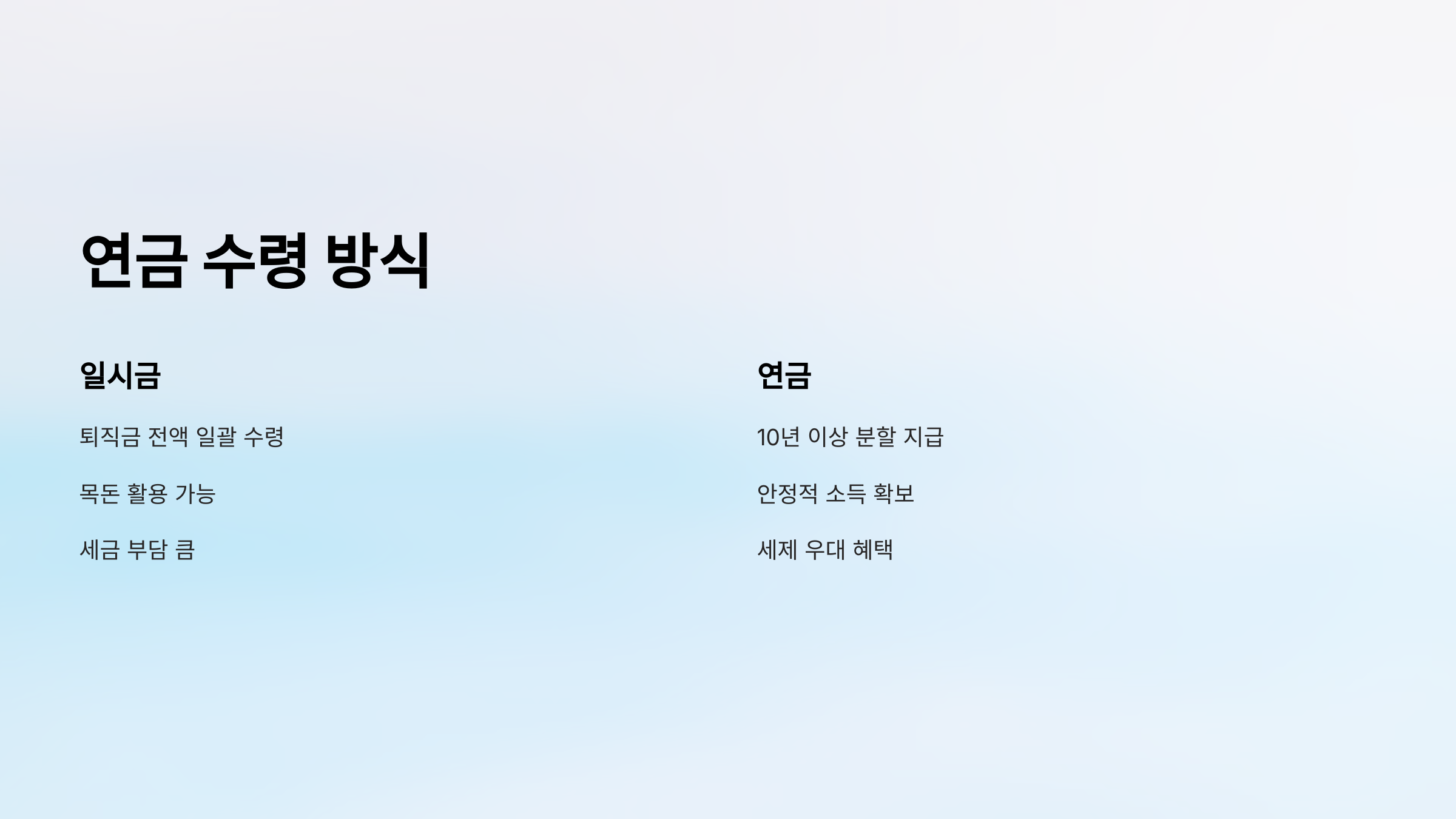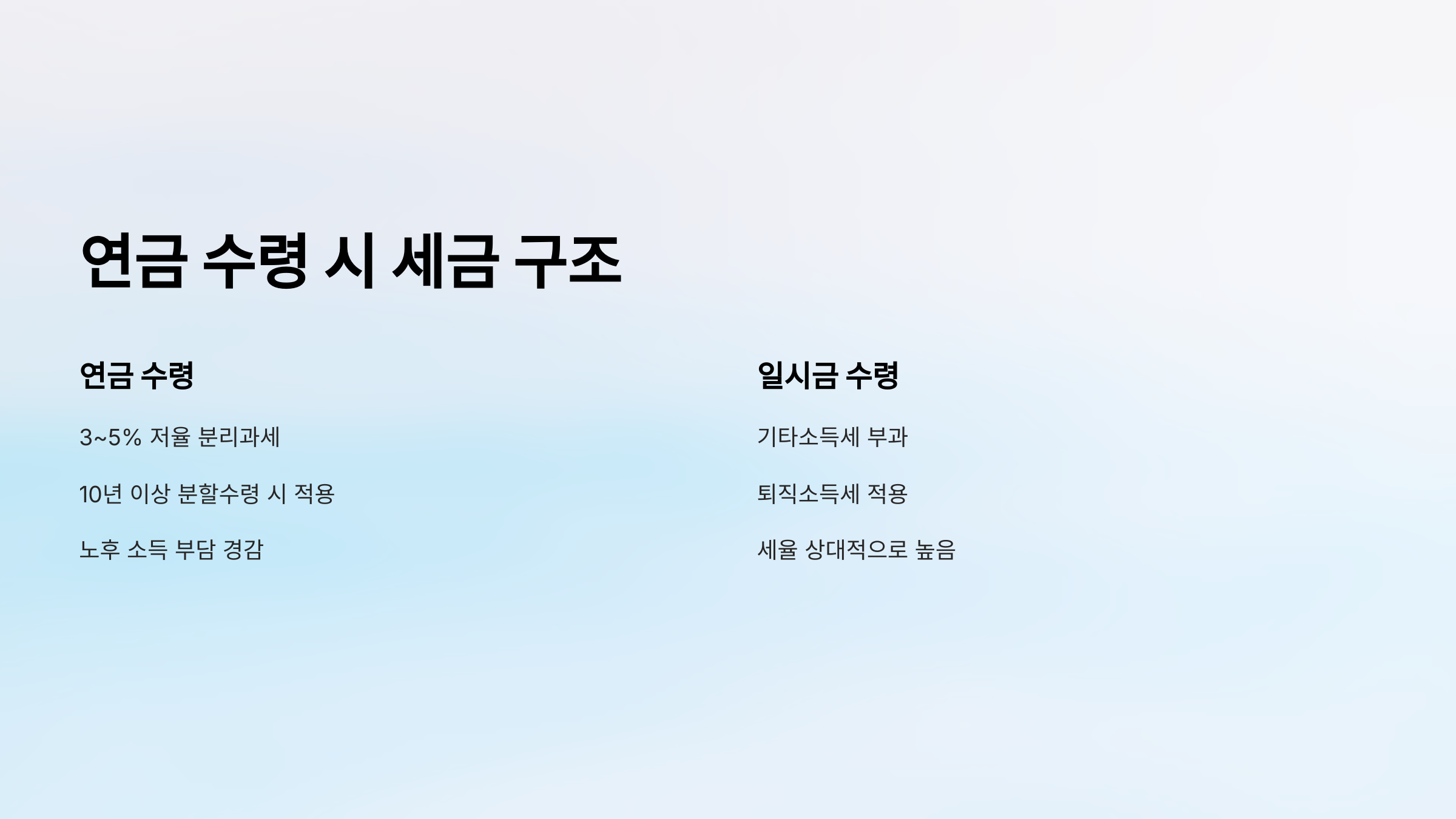 - 연금 수령 시점에 따라 세금 차이 크므로 타이밍 조절도 전략