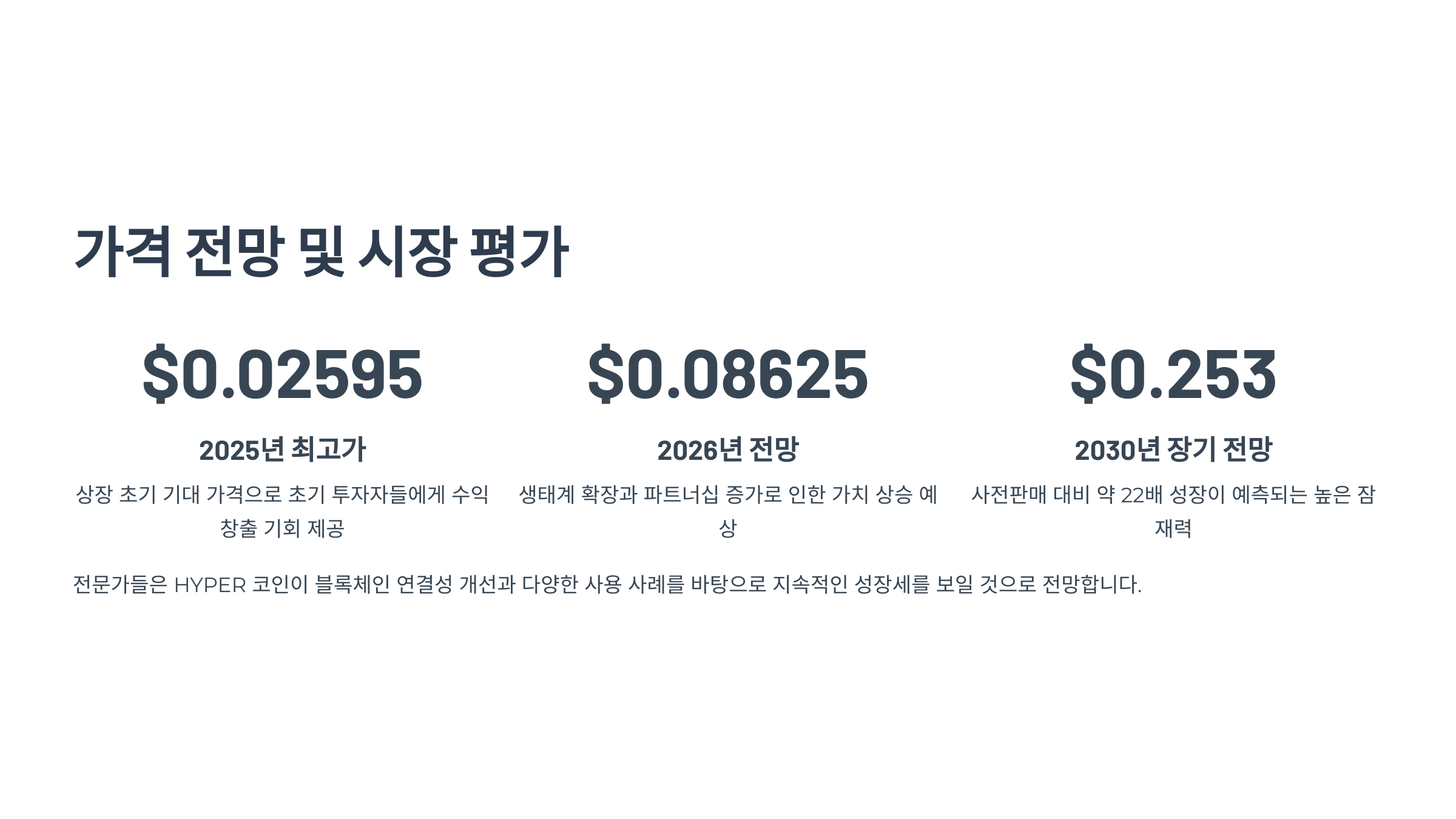 하이퍼레인 코인의 장기 전망은 더 흥미로워요. CoinCodex의 장기 예측 모델에 따르면 2026년 평균 $0.61, 2027년 $0.69, 2029년 $1.02, 그리고 2030년에는 $1.30까지도 가능하다는 분석이 나왔습니다.
